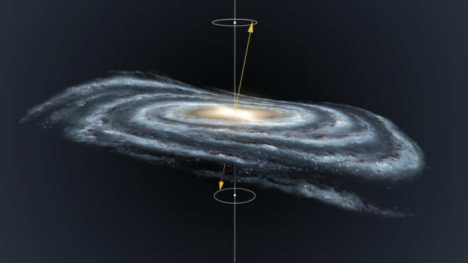 En 2020, una investigación anunció la detección de la precesión del alabeo del disco de la Vía Láctea, es decir, que la deformación que presenta esta región más externa de nuestra galaxia no se encuentra estática, sino que, al igual que un trompo que gira sobre sí mismo, la orientación de su eje de rotación también cambia con el tiempo. Además, los investigadores encontraron que esta es más rápida de lo que predicen las teorías: un ciclo cada 600-700 millones de años, unas tres veces el tiempo que tarda el Sol en rotar alrededor del centro de la Vía Láctea.